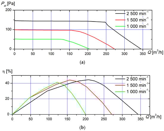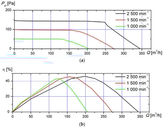 In all the performance curves (Figure 7), the unstable zone of the operating mode can be observed. In this zone, the fan curve becomes flat; therefore, the minimal change in system pressure has a significant effect on the flow rate. When working in this mode, the number of vibrations increases, and the efficiency of the device decreases Gustafson [].