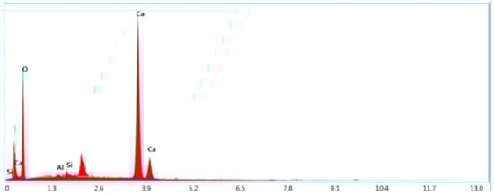 In this research, recycled gypsum was sourced from a local wet market stall that sells the powder as plaster for nearby construction projects. Recycled gypsum is typically prepared from excess and rejected plasterboard from manufacturing, new construction, and demolition [23]. Contaminants from nails, screws, paint, wall coverings, etc., are removed before the recycling process. The collected waste gypsum is pulverized into powder form and is typically heated at 130 °C to 160 °C. The Energy Dispersive X-ray (EDX) test results indicated the mean elemental distribution in the recycled gypsum in Table 1 and the EDX spectrum in Figure 1.
