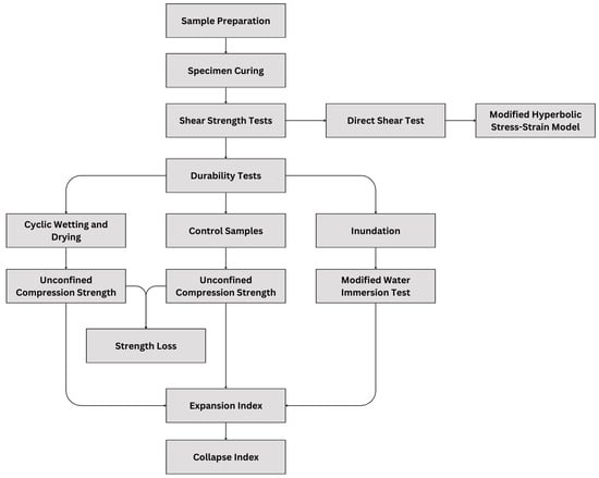 Clay was crushed and oven-dried before being mixed with recycled gypsum and rice husk ash. The direct shear tests used proportions of 0%, 5%, 10%, and 15% gypsum and 10% RHA. The admixture proportion of 15% gypsum + 10% rice husk ash was selected for the durability tests, as Tan and Adajar [37] reported that this ratio resulted in the most significant maximum dry density, least optimum moisture content, and lowest expansion index, which rendered the sample non-expansive.