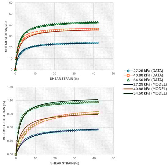Summing all modified hyperbolic parameters in a predictive function, the model can estimate the stress–strain response of the test specimen. The shear stress and the volumetric strain can be approximated through the following equations: