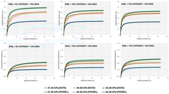 The ductile behavior shown by the stress–strain response of the test specimen exhibited a hyperbolic form. A modified hyperbolic model was generated to predict the treated specimen’s shear-stress–shear-strain and volumetric-strain–shear-strain relationship. The resulting model yielded a reasonable projection of the stress–strain and volumetric-strain–shear-strain response due to the ductile and compressive behavior of the test specimen.