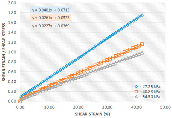 Parameters a and b are the resulting straight-line function’s intercept and slope. These values are the reciprocals of the initial shear modulus (Gi) and asymptotic shear stress (τult), respectively.