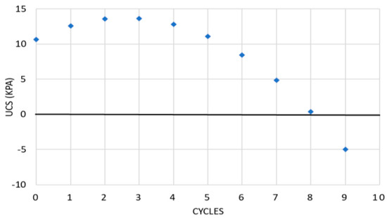 Variation of UCS of soil cured for 30 days as a function of cycles.