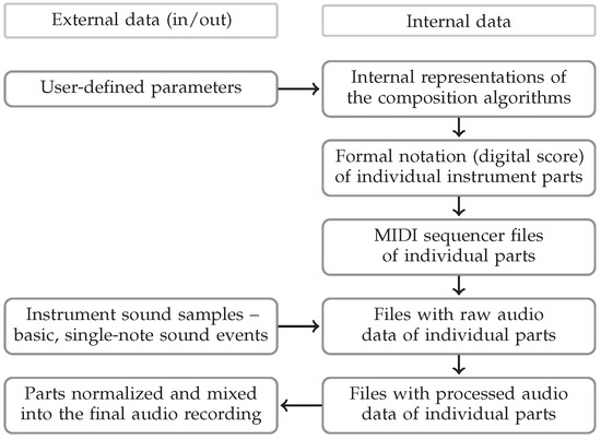 User-provided data represent a concept. The Generator uses data structures such as arrays (single type), lists (multiple types), maps (key-value), or rule sets to internally represent higher-level abstract musical structures throughout composition algorithms. The algorithms produce digital scores for individual tracks based on different principles, with elements of interpretation coded as performance marks (dynamics and articulation). Scores are converted to sequencer control data (MIDI—Musical Instrument Digital Interface) and supplemented with interpretation elements (pitch tuning). Sequencer control of a non-real-time sampler through MIDI is an equivalent of a performance and a recording (an output is directed into an audio file). Audio tracks are processed and mixed to undergo a mastering process.