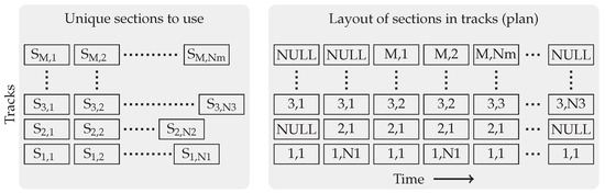 The structure of a composition with M tracks, each one using Ni unique sections Si,j (i—track index, j—unique section index within a track-assigned section list), and an example of a layout.