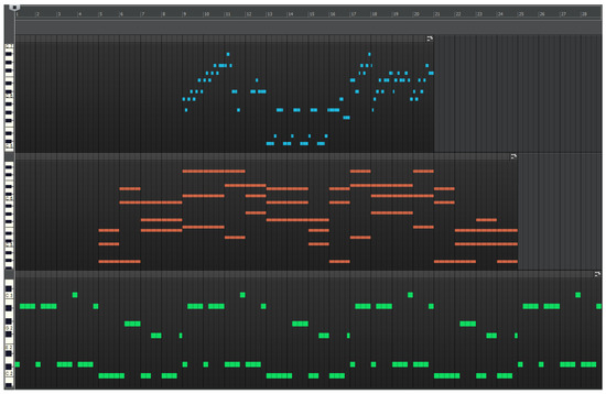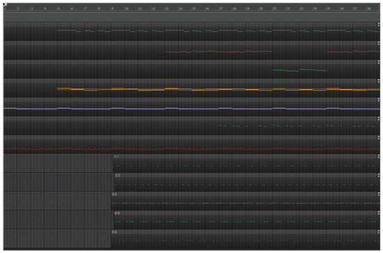 A form needs to be substantiated into a specific structure. This purpose may be served by the concept of patterns and order adapted from music trackers and groove boxes [33]. Thus, the structure of a composition is represented by a two-dimensional plan consisting of a set of instrument-assigned tracks, each with its own sequence of sections. A section represents a constant-length segment of a track, usually a few measures. It is common for musical material to be reused throughout a composition. Therefore, each track has its own set of unique sections to pick from, and the plan stores a sequence of section IDs, arranged in any order within tracks, including repetitions or omissions (Figure 3). It is here that particular forms, symmetric or asymmetric, such as a reprise form, rondo, variations, chorus–verse, and others, are substantiated into a layout, such as in Figure 3, considering internal sub-parts, use of instruments, breaks, etc. These choices are rule-based, with different rules for particular genres. Elements of fuzzy logic are used to guide probability-based decisions.