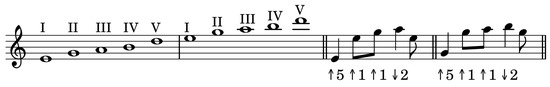 An example of the second motif from Table 3 (mot2) in a direct form (non-altered) in the “e” anhemitonic pentatonic scale (presented on the left through two octaves), starting from the first and the second step of the scale.