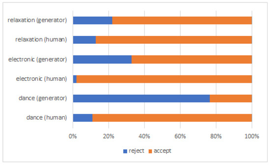As represented in Figure 12, the dance music generated by our system had the lowest level of acceptance (about 24%). It is interesting to observe that the recordings generated as relaxation music were largely accepted by the listeners (about 78%). Rejections of human-created recordings may be unexpected, but they can be explained by the procedure of selecting recordings for the test. In order to compare generated content with typical real-world counterparts, human-created recordings were randomly picked from a large commercial repository based on tags provided by authors or publishers to reflect the way they are tagged in real-use cases. Employing an external expert group to pick or tag musical excerpts might reduce rejections, but such a group—small by its nature—would be biased depending on their predominant experience with particular genres or stages of the music business. The obtained results reflect an actual problem with objective categorization of recordings into separate, well-defined genres, which affects the performance of the Critic part of our system, initially based on human ratings.