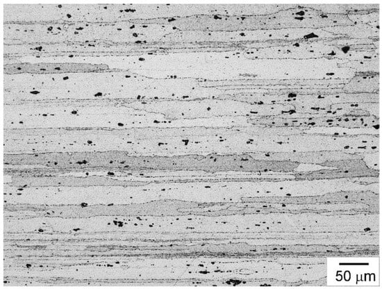 Microstructural investigations were carried out on cross sections perpendicular to the tool traverse direction. The metallographic specimens were etched with Keller’s reagent (2 mL HF + 3 mL HCl + 5 mL HNO3 + 190 mL distilled water). Microscopic examinations were performed using a Keyence VHX-7000 light microscope (Keyence Ltd., Osaka, Japan). The aluminum alloy had a typical rolling microstructure with highly elongated grains typical of rolled material, which reflected the rolling direction and gave it a banded feature. The average length of the grains of the α primary solution in the analyzed alloy was approximately 290 µm. Moreover, numerous precipitates of intermetallic phases were found in the alloy. These precipitates were located both inside the grains and at the grain boundaries of the solid solution. Identification of the chemical composition of the precipitates was carried out using an Oxford Instruments EDS microanalyzer (Oxford Instruments Plc., Abingdon, UK). These studies showed that the AA7075 alloy contains precipitates rich in Al, Zn, and Cu, but also precipitates containing Al, Fe, and Cu and less numerous phases rich in Al, Si, and Zn and Al, Zn, and Mg. Studies of the phases occurring in the AA7075 aluminum alloy were presented in a previous work [16].