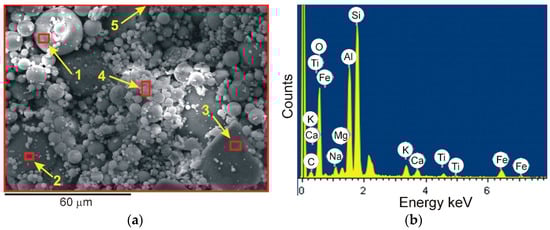 Analyzing the EDS results of the A-1 powder, it can be noticed that the differences in the shape and morphology of the particles found during microscopic examination were also reflected in differences in their chemical composition. In the case of smaller particles characterized by a polyhedral shape, the EDS analysis revealed the presence of silicon and oxygen, which proves that these particles are silica. This statement is also confirmed by the characteristic shape of the particles, very often observed in the case of SiO2. A more complex chemical composition was found for the dominant spheroidal particles. In addition to silicon and oxygen, these particles also contained aluminum, and in smaller amounts, Ti, Fe, Na, K, Ca, and Mg.