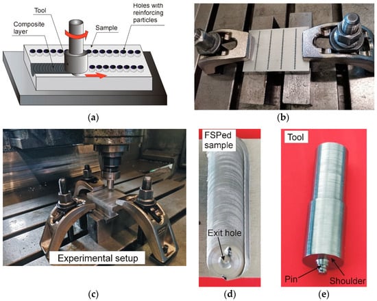 The composite surface layer was produced by means of the FSP method. An original solution was used to introduce the reinforcing phase into the metal matrix, namely the hole method with a shifted working zone of the tool [35]. In the hole method, the reinforcing material is placed in cylindrical chambers hollowed out in the sample surface. Such chambers act as reservoirs from which the reinforcing material is directed to the plasticized matrix using a tool. A diagram of the hole method is shown in Figure 5a, and Figure 5b–e present the subsequent stages of friction stir processing using the hole method, the tool utilized in the FSP method, and the macroscopic effect of processing with a characteristic “exit hole” at the end of the band.