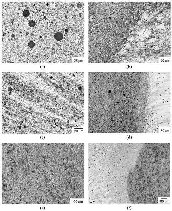 Microstructure of composite reinforced with A-1 particles (a,b), A-2 particles (c,d), and SiC particles (e,f). Stirring zone (a,c,e), boundary of stirring zone, and thermomechanically affected zone (b,d,f). Etched, light microscopy.