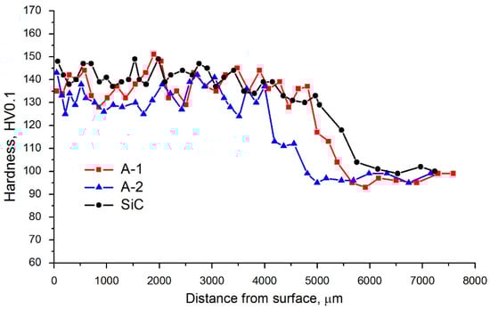 A comparative assessment of the hardness measurement results reveals that in the case of the SiC and A-1 particles, a decrease in hardness occurred at a depth of approximately 5 mm from the surface, which is almost a millimeter greater than in the case of the A-2 powder. This fact can be explained primarily by the differences in the shape and morphology of the powders used. Powder A-2 was characterized by a more complex shape and geometric surface structure, which made it difficult to distribute the particles throughout the volume of the plasticized composite matrix. It is also worth noting that in the case of the composite reinforced with the A-1 particles, the hardness level was comparable to the hardness of the material reinforced with SiC particles. The hardness of the composite reinforced with the A-2 particles was approximately 7% lower than the hardness of the reference sample.