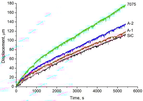 The linear loss of the sample reinforced with the A-1 phase in the tribological test was 118.5 µm, and the sample containing the A-2 phase was 134 µm. This loss in the case of the initial aluminum alloy was 176.6 μm; therefore, it was higher by 49% and 32%, respectively, compared to the linear loss recorded for the composite samples reinforced with phases A-1 and A-2. The abrasive wear resistance, expressed by the size of the registered linear losses of the samples, was therefore 32.9% higher in the case of the composite reinforced with the A-1 phase than that of the abrasion resistance of the AA7075 aluminum alloy and by 24.1% in the case of the A-2 reinforcing phase.