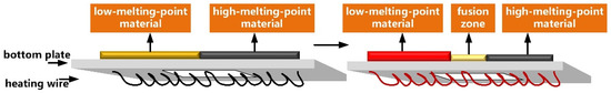 The sparse and dense winding of the heating wire, the design of the insulation unit, and the electronically controlled heating make it easier to attain a controlled temperature gradient. By heating some parts of the sample at high temperatures, the sample is subjected to different temperature gradients, and a semi-molten and semi-solidified state can be achieved. Afterward, the experimental process is observed through the distinctive densities of the same substance in different states and the principles of X-ray transmission imaging [17]. The melting point of pure BiFeO3 is about 960 °C. Co-solvent addition can reduce the melting point up to as low as 800 °C. By utilizing this property, low-melting-point BiFeO3 is placed on the left and the high-melting-point counterpart is placed on the right. Upon heating, the low-melting-point BiFeO3 becomes molten, and the solid-liquid interface appears. The solid-liquid interfaces of the unmelted and molten BiFeO3 can be observed using the X-ray transmission imaging module. The heating process is shown in Figure 4.