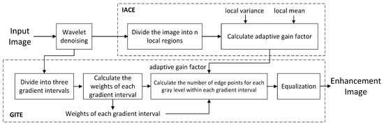 Finally, the cumulative distribution function of the normalized image is computed. The original gradient levels are mapped to the new gradient levels through transformation, and the gradient levels in the original image are replaced by the new ones. The GTIE-IACE algorithm is illustrated in Figure 10.