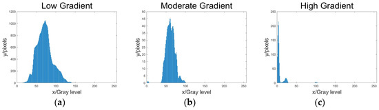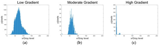 (a) Histogram of the number of edge point pixels at each gray level in the low gradient interval; (b) Histogram of the number of edge point pixels at each gray level in the moderate gradient interval; (c) Histogram of the number of edge point pixels at each gray level in the high gradient interval.