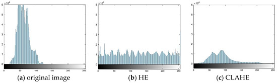Histogram equalization algorithms achieve visual enhancement of images by redistributing the gray level distributions of image pixels, but the algorithms have shortcomings such as loss of image details and over-enhancement. In order to overcome these drawbacks, improved histogram equalization methods have emerged, such as Adaptive Histogram Equalization (AHE) and Contrast Limited Adaptive Histogram Equalization (CLAHE). AHE and CLAHE perform histogram equalization based on local features of the image. They divide an image into smaller regions and then carry out independent histogram equalization for each image region in order to preserve the local details of the image. CLAHE, based on AHE, introduces a contrast-limiting mechanism to avoid over-enhancement. However, these histogram equalization algorithms do not fully consider the information of neighboring regions of each pixel during contrast enhancement, which will generate noise in the output image. To solve these problems, Tang and Mat Isa [7] proposed a dual-sub-image equalization algorithm based on histogram modification. This algorithm enhances the image contrast without losing the details of the image and also maintains the brightness of the image. However, it results in distortion of the enhanced image when the gray level probability distributions of the two sub-images are uneven. Deng et al. [8] put forward a contrast enhancement method based on adaptive histogram correction and equalization. The method combines adaptive histogram correction and histogram equalization and effectively reduces artifacts and insufficient local detail enhancement caused by traditional methods. In addition, there have been many variants of the CLAHE and AHE that address the characteristics of low image contrast and blurry images. For example, Alhajlah et al. [9] used CLAHE and adaptive color correction methods to address the problem of blurred underwater images caused by limited available light, low resolution, and regular cameras. Ye et al. [10] proposed a bi-histogram equalization algorithm with adaptive image correction to solve the problems of image brightness bias, image over-enhancement, and gray level merging that occur in traditional histogram equalization algorithms.