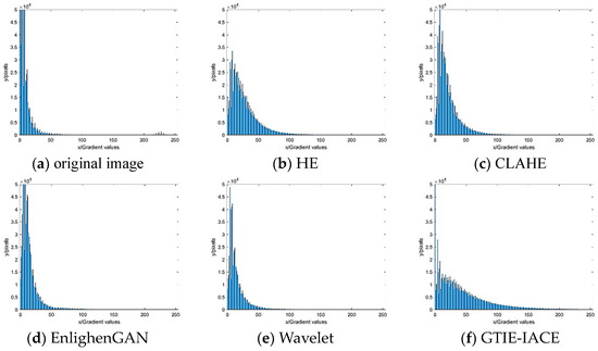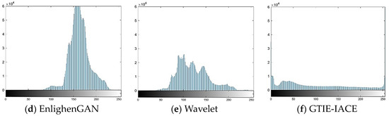 According to the histograms, the grey level values of the image enhanced using the GTIE algorithm effectively cover the entire grey level range. This indicates the best enhancement performance among different algorithms (Figure 12).