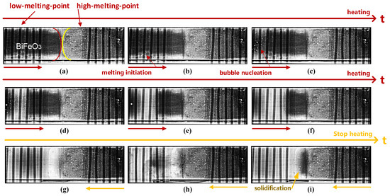 Changes in the density of the melt cause changes in the X-ray transmission images, usually because heating causes varying densities over different areas of the melt and changes in X-ray absorption. The denser melts appear as darker areas in the images. In Figure 14a, the marked area on the left side of the image is darker and denser, and it shows stronger X-ray absorption. In the meantime, BiFeO3 still maintains a solid structure at this time and has not begun to melt. The color of BiFeO3 in Figure 14b becomes lighter, and the crystals start to melt. The melting phenomenon of BiFeO3 in Figure 14c is more obvious. After heating, some crystals of BiFeO3 have completely melted. The molten BiFeO3 absorbs less X-rays, and it is in a transparent state. Furthermore, it exhibits a tendency to migrate to the right. From Figure 14b–f, it can be observed that, with the increase in temperature, BiFeO3 melts, and bubbles generated during the melting process appear in the red marked area on the left side. After melting, cooling and solidification are carried out, as shown in Figure 14g–i, with the gradual decrease in temperature, gradual solidification of the melt is observed. The melt region gradually shrinks and eventually changes to a solid state. Eventually, a solidified state is noted in Figure 14i. It marks the completion of the phase transition process.