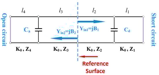 The above results are achieved by neglecting discontinuities in the structure shown in Figure 1. In order to obtain a more accurate resonant frequency formulation, transmission line discontinuities, including open-end capacitance and step junction effects, must be considered. The open-end capacitance can be directly replaced by an additional length of transmission line during the actual design process. The step junction effects are mainly the discontinuity capacitance generated by the step junction in the transmission line []. The reason for this is that the connection of two transmission lines with different characteristic impedances excites higher TM modes due to impedance discontinuities, but these higher TM modes are cut off, and the resulting effect can be replaced by an equivalent capacitance. In the calculation, this equivalent capacitance can be obtained either by numerical analysis of the electromagnetic field distribution at the step junction surface or by using the theoretical formulas in the conclusions of existing studies [,]. After considering the above discontinuities, a more accurate expression for the resonant frequency can be further derived.