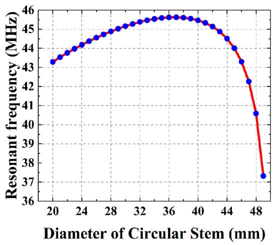As shown in Figure 3, the radius of the conductor inside the cylindrical Stem should not be too large in order to prevent the connection between the Dee and the Stem from creating additional impedance discontinuities. The calculation ensures that the length of the Stem’s inner conductor remains constant while only the diameter changes. From Figure 4, the maximum resonant frequency of the RF cavity with the circular Stem structure does not exceed 46 MHz, while the resonant frequency of the RF cavity with the rectangular Stem structure can easily reach 46 MHz for the same length. In addition, when the resonant frequency of the RF cavity with the rectangular Stem structure is 45.321 MHz, the resonant frequency of the RF cavity with the circular Stem structure under the equivalent radius is 44.952 MHz. Because the characteristic impedance of a circular Stem is greater than that of a rectangular Stem, the resonance frequency of the cavity is reduced while the length remains constant. According to the calculation formula for the characteristic impedance of the circular coaxial transmission line whose filling medium is air, Zc = 138 lg(D/d) Ω, where d is the diameter of the inner conductor and D is the diameter of the outer conductor. When the diameter of the circular Stem increases, the radius ratio of the circular coaxial line decreases, the characteristic impedance becomes smaller, and the resonant frequency of the cavity increases. Therefore, the designed target resonant frequency value can be achieved when the diameter of the circular Stem inner conductor is adequate. However, increasing the diameter leads to an increase in the impedance discontinuity at the connection between the Dee and the Stem inner conductor, resulting in an increase in the step capacitance, which leads to a decrease in the resonant frequency of the RF cavity. It is calculated that the RF cavity resonant frequency decreases from 45.224 MHz to 42.001 MHz when the step capacitance is increased from 1 pF to 10 pF. However, when the step capacitance is increased from 10 pF to 100 pF, the RF cavity resonant frequency decreases rapidly to 26.145 MHz. In addition, the increase in the diameter of the conductor inside the circular Stem increases the step junction surface loss and the RF cavity surface loss. After comprehensive consideration, a rectangular Stem is used to connect to the Dee, making the step capacitance at the contact surface as small as possible.