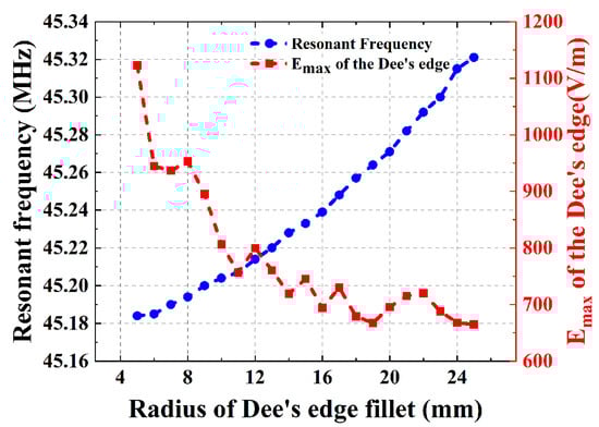 In addition, since the RF cavity utilizes a classical 180° Dee, tip effects need to be avoided at the edges, and therefore the corners of the Dee are suitably chamfered. From Figure 5, it can be observed that the size of the Dee’s edge fillet radius has a limited effect on the resonant frequency of the RF cavity. In addition, the electric field strength at the edge of the Dee can be significantly reduced by increasing the radius of the edge fillet. Therefore, it is sufficient to ensure that the size of the Dee’s edge fillet radius meets the requirement of the maximum electric field strength during design.