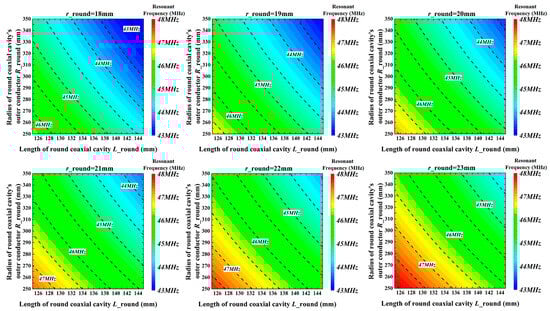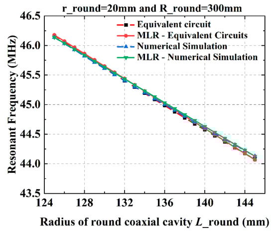 Figure 13 shows the effects of the round cavity length L on the resonant frequency when ric = 20 mm and roc = 240 mm. It illustrates a high degree of fit between numerical simulation and equivalent circuit calculations. The errors in the prediction results at the target frequency for both models do not surpass 1%. They remain under 0.3%, satisfying the engineering design’s predictive needs.
