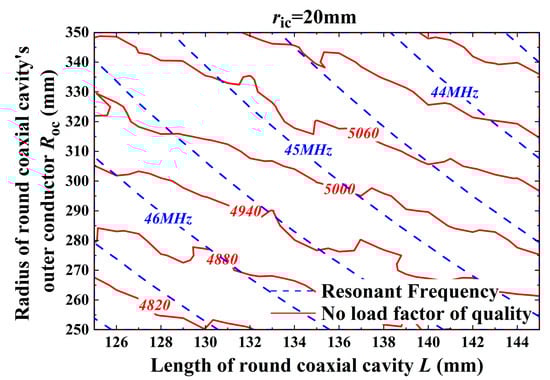 In order to further determine the selection of each structural parameter of the round coaxial resonator, the effect of these parameters on the unloaded quality factor Q0 of the cavity is calculated. Figure 7 shows the effect of roc and L on the magnitude of the unloaded quality factor of the RF cavity for ric = 20 mm. It can be determined that the larger roc and L are, the larger the Q0 value of the RF cavity is, and different Q0 values can be taken at the same resonant frequency.