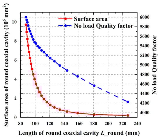 Effects of different round coaxial resonator lengths on the surface area of the round coaxial resonator and unloaded quality factor at the same resonant frequency.