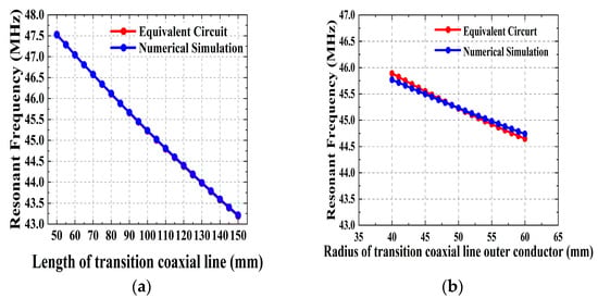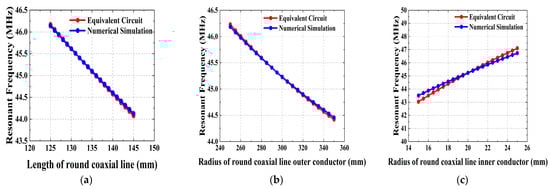 The effect of the structural parameters of the round coaxial resonator on the resonant frequency of the cavity is shown in Figure 10, where it can be seen that the longer the length, the larger the radius of the outer conductor, and the smaller the radius of the inner conductor, the smaller the resonant frequency of the RF cavity. At the same time, it can be seen that the numerical calculation results and the equivalent circuit calculation results are consistent and show good correlation; only the change in the radius of the inner conductor of the round coaxial will produce a relatively large error; the maximum error reaches about 2.7%. The main reason is that changing the radius of the inner conductor of a round coaxial resonator results in a change in the dimensions of the transition coaxial resonator part. When the dimensions of the rectangular part of the transition coaxial and the dimensions of the round part are similar, the error in the results of the characteristic impedance of the transition coaxial calculated by using the empirical formula is small. However, when there is a large difference between the dimensions of the rectangular part and the round part, the results obtained from the empirical formula tend to produce certain errors, which can eventually result in the generation of resonant frequency calculation errors. This has been taken into account in the design when modeling based on the target frequency, so that the error at the target frequency is small, about 0.1%.