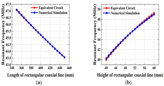 Impact of rectangular coaxial line parameters on the resonant frequency of cavity. (a) Line length and (b) line height.