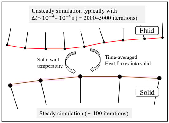 In certain transient conjugate heat transfer analyses characterized by prolonged periods, the quasi-steady state approximation becomes applicable [,,,]. Stefan Voigt et al. [] proposed an alternative quasi-steady-state technique termed the uFFTB method, which is depicted in Figure 4. Iterative coupling between the fluid and solid domains, achieved through independent computations within each domain until convergence, enhances computational efficiency while ensuring conservation of heat flux.