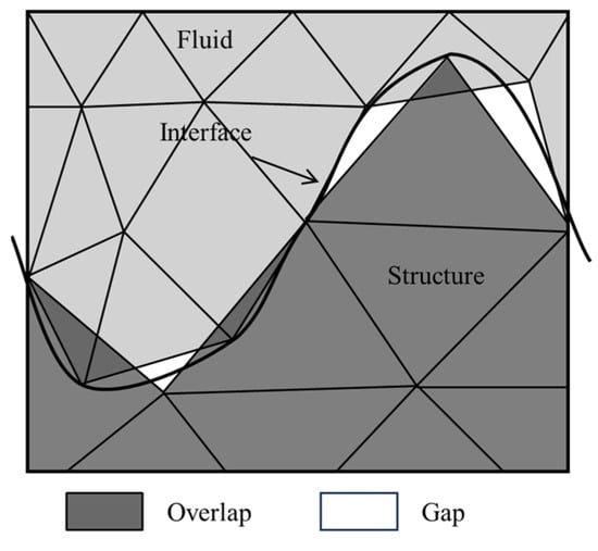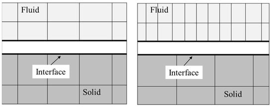 Within the realm of partitioned techniques for conveying conjugate heat transfer in air-cooled turbines, a plethora of investigations [,,,] have adopted a fully conformal meshing strategy, ensuring an exact correspondence between the fluid and solid nodes at the fluid–solid interface, as depicted in Figure 5. Nevertheless, in tackling the complexities inherent to large-scale engineering challenges, it is commonplace to encounter considerable discrepancies in the topology and resolution of grids across different media domains, as exemplified in Figure 6. One of the intrinsic challenges of conjugate heat transfer simulations lies in the necessity for a meticulous alignment of boundary points along the solid–fluid interface [], which imposes stringent constraints on the preservation of boundary heat flux in engineering applications that necessitate such simulations. Consequently, the development of a data interpolation methodology that upholds conservation principles across non-conforming grids emerges as a pivotal consideration for the successful implementation of conjugate heat transfer simulations within extensive engineering frameworks.