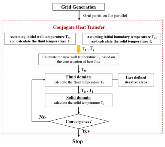The partitioned approach has garnered significant attention from a myriad of investigators [,,]. It partitions the problem into two subdomains, each governed by a separate solver, simulating the fluid and solid regions separately. This strategy allows for the seamless integration of existing fluid flow or heat conduction solvers into a comprehensive conjugate heat transfer solver without imposing significant alterations upon the original computational program.