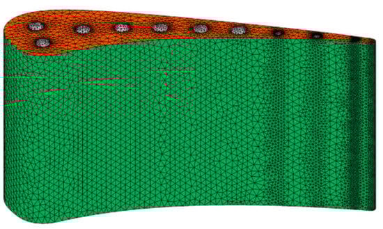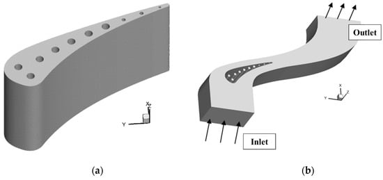 The NASA-C3X turbine vane is equipped with a strategic layout featuring ten radial cooling holes. The detailed configuration of these holes for the C3X vane is delineated in reference []. Leveraging the experimental specifications of this vane, a comprehensive computational model encompassing both the fluid dynamics and solid structures of the C3X vane has been devised, as depicted in Figure 10.
