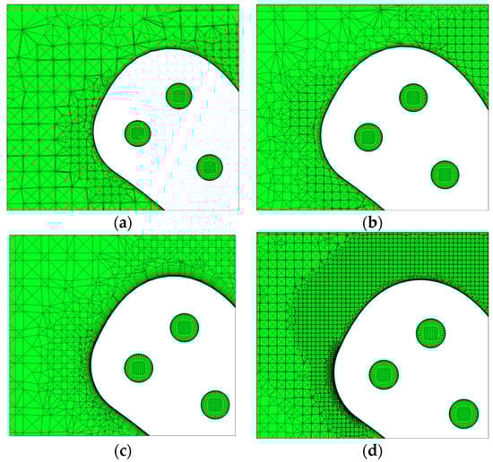 Fluid domain mesh distribution: (a) about 1,500,000 elements; (b) about 2,200,000 elements; (c) about 4,800,000 elements; and (d) about 9,300,000 elements.