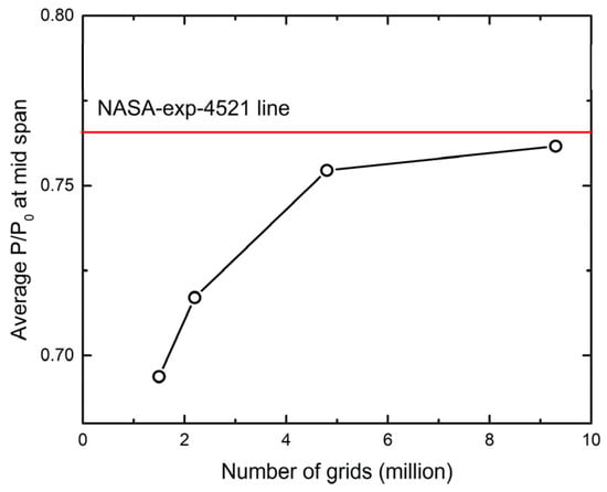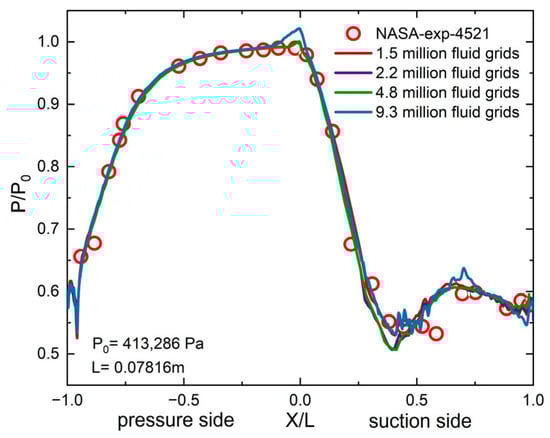 The comparison of the pressure distribution at mid-span across four different density flow field meshes with NASA experimental results reveals that the trend in pressure distribution for all four mesh densities closely aligns with the experimental data, as shown in Figure 13. The pressure drop along the surface is relatively gradual, with an increase in the rate of decrease observed near the trailing edge. On the suction surface, the pressure drops rapidly in the intake region, followed by a more gradual acceleration of the flow after the midsection (approximately p/p0 = 0.5–0.6). The calculation results exhibit a sharp rise in pressure at the leading-edge stagnation point, which may be attributed to the accumulation of flow due to an excessive lack of uniformity in the grid relative to the surrounding area at the stagnation point. Consequently, the largest pressure surge is observed in the finest mesh with 9.3 million cells. Beyond the midsection of the suction surface, pressure fluctuations occur, accompanied by an inverse pressure gradient, indicating the complexity of the flow characteristics in this region, which can lead to shockwave formation and separation phenomena. In areas of complex flow, denser meshes yield calculations that are closer to the experimental data, although overall discrepancies remain minor.