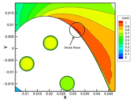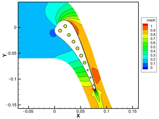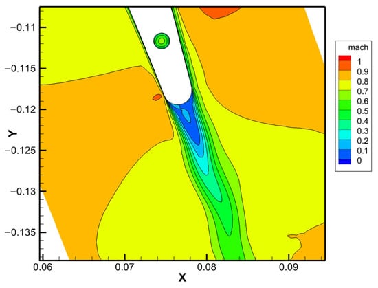 Figure 15 illustrates the isentropic Mach number distribution along the mid-span section of the C3X blade. It is evident that the flow within the blade channel is predominantly subsonic. Notably, a faint shockwave (Mach > 1) is discernible on the suction side at approximately 40% axial chord (Figure 16). Additionally, the leading edge of the blade is characterized by a relatively large arc shape, and the curvature radius exhibits minimal variation. Such a design minimizes energy loss when the incidence angle at the inlet varies significantly. Meanwhile, the influence of these shockwaves on both the pressure and suction sides appears to be minimal. As depicted in Figure 17, the flow state at the trailing edge of the blade is relatively regular, with the vortex growth reaching approximately 1.5 times the diameter of the trailing edge. Simultaneously, there is a small region on the pressure side where the Mach number increases to around 0.93; however, no shockwave or boundary layer separation is formed.