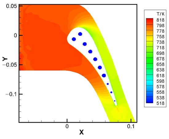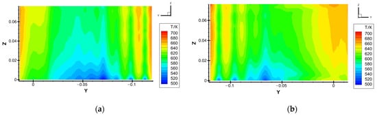 The fluid domain’s coupled temperature contours, as depicted in Figure 18, reveal a uniform variation in the mainstream field, with temperatures consistently surpassing 730 K, with the exception of the vicinity proximal to the interface. In contrast, the internal cooling channel is significantly influenced by the injected cooling airflow, leading to a temperature distribution that closely mirrors that of the incoming.