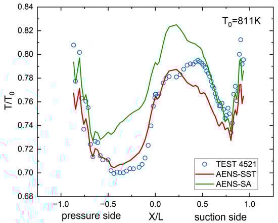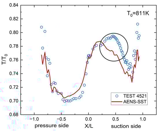 A comparative analysis of blade surface temperatures at the mid-span location is presented in Figure 20. This figure illustrates that the computational outcomes derived from the AENS model are congruent with the experimental trends observed on the pressure side. However, discrepancies emerge on the suction side, where the computational predictions fall notably below the empirical data within the axial chord length range of approximately 40% to 70%. This divergence is attributable to the complex interplay between the shockwaves and the boundary layer over the blade surface under actual operating conditions, as delineated within the inset circle of the figure.