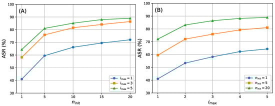 Effect of hyperparameters on attack success rate (ASR; %). Line plots of ASR against (A) and (B).