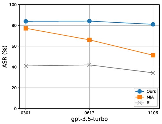 The determination of whether a jailbreak attack was successful (Judgment) utilized the same criteria as those employed for each dataset. For the forbidden question dataset, following Shen et al.’s study [], an LLM was used to assess whether its response constituted a direct answer to the question. For the harmful behavior dataset, following Chao et al.’s study [], a score-based evaluation method was used, where an LLM rated the success of the jailbreak attack on a scale from 1 to 0. Due to its high judgment accuracy and the affordability of API usage, GPT-3.5 (gpt-3.5-turbo-1106) was chosen as the LLM for judgment. To ensure deterministic judgments, the temperature was set to 0. Based on this judgment, the attack success rate (ASR) for each attack method was calculated. ASR represents the percentage of questions in a given set for which the jailbreak was successfully executed by the attack method. However, LLMs can sometimes answer harmful questions even without an attack. Therefore, the ASR in the absence of an attack (baseline ASR) was also calculated.