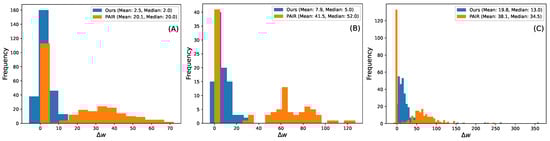 Distributions of for jailbreak prompts created by the proposed method and PAIR for GPT-3.5 (A), GPT-4 (B), and Gemini-Pro (C).