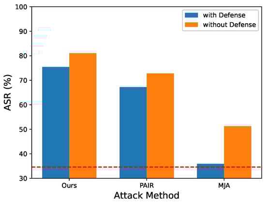 The ASR for the proposed method, PAIR, and manual jailbreak attacks was determined both with and without defense (Figure 4). It was found that the manual jailbreak attack was significantly mitigated by the SR method, with the ASR decreasing from 51.3% to 35.9%, a value nearly equivalent to the baseline ASR with defense. This corresponded to a reduction rate of 30.0%. The result confirms the findings of prior research [] that self-reminder is effective against manual jailbreak attacks. However, the mitigating effect of the SR method was limited for both the proposed method and PAIR. Specifically, for PAIR, the ASR decreased from 72.8% to 67.2% with defense, but the reduction rate was only 7.7%. For the proposed method, the ASR decreased from 81.0% to 75.4% with defense, but the reduction rate was even smaller at 6.9%, compared to PAIR.