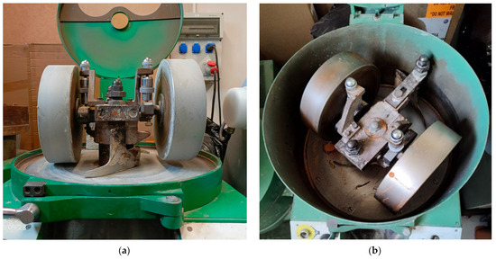 For the purposes of the experiment, a mass containing 2% of barley malt binder was prepared in a laboratory circular mixer LM-2e from Multiserw Morek (Brzeźnica, Poland), which is shown in Figure 2. The circular mixer performs two processes: kneading and grinding. Kneading is carried out by rolling the rollers onto the moulding sand. Grinding is carried out by semi-sliding rollers rolling over the prepared mass. The outer and inner blades, in turn, move the mass under the rollers as the working elements rotate. The use of a circular mixer ensures even distribution of the binding material in the mixture and prevents the mass from clumping during mixing. The use of a rotary mixer thus enables the formation of an adhesive bond between sand grains in the presence of a binding material.