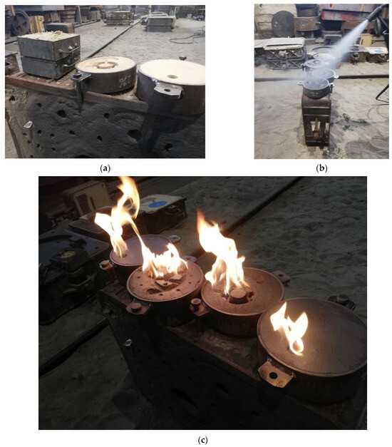 Preparing the moulds for pouring: (a) the mould after drying; (b) applying the coating to the mould; (c) firing the coating.