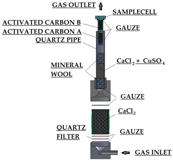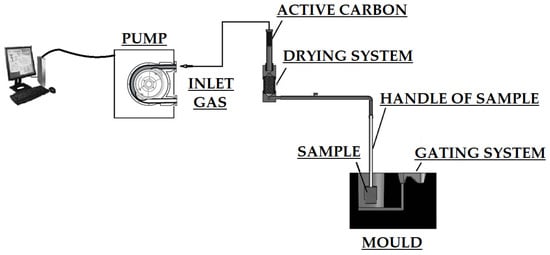 During the process of pouring the liquid alloy into the mould cavity, the organic components of the analysed experimental moulding sand are burned and/or gasified. Therefore, it was decided to check the volume of gases produced. Investigations of gases emitted in the test foundry plant were conducted using the original method developed at the Faculty of Foundry Engineering, AGH University of Krakow [10]. A sample of the investigated moulding sand, moulded into the standard high-silica sand matrix in a roll shape with dimensions of 50 × 50 mm and weighing about 150 g, was compacted using a moulder’s rammer stroke. This sample was then subjected to the pouring of liquid cast iron at a temperature of 1350 °C (Figure 5). The analysis was performed on two samples [10]. Gases emitted from the sample after being poured with liquid metal were directed through a steel pipe, passing through a drying system and a capsule containing active carbon (for BTEX measurement) (Figure 6). The volume of gases were recorded using a peristaltic pump at a rate of every 1 s for a period of 10–15 min (if it took longer, until a constant gas volume was established). The entire mould was made of green sand. Inside the metal tube, two layers of active carbon, separated from each other, were placed. The first layer (A), containing 700 mg of active carbon, served as the primary adsorption site, while the second layer (B), containing 200 mg of active carbon, acted as a control, providing information on a potential ‘breakthrough’ of the first adsorption layer [10].