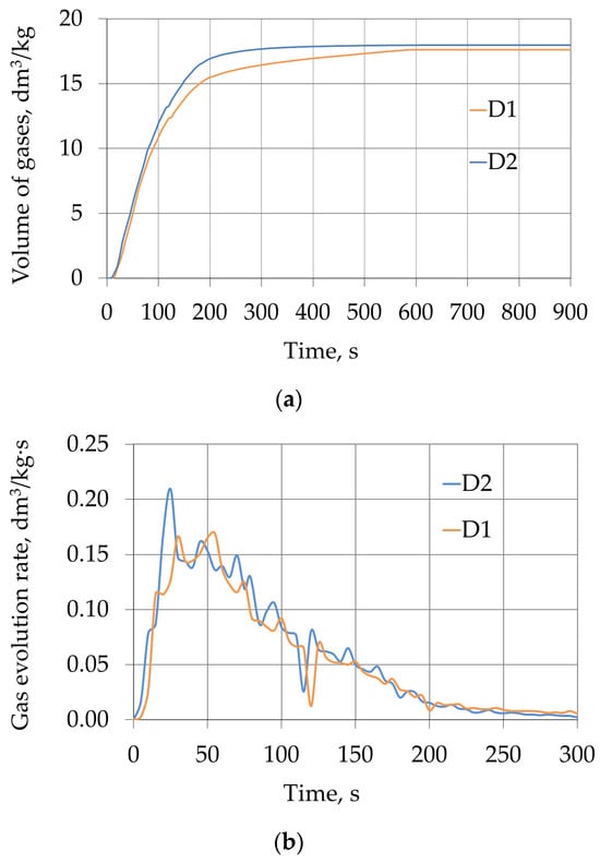 Gas volume and gas evolution rate emitted from moulding sand: (a) volume of gas evolved for samples No. 1 (D1) and No. 2 (D2); (b) gas evolution rate for evolved for samples No. 1 (D1) and No. 2 (D2).