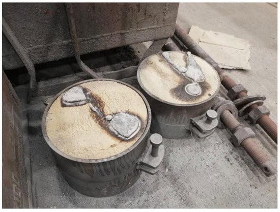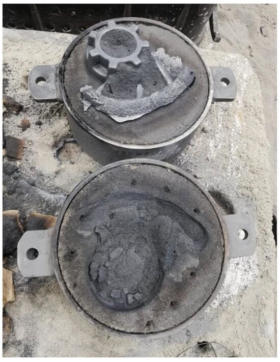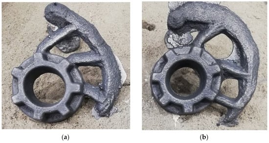 The moulds were poured horizontally. The poured moulds are shown in Figure 8, and the raw casting before knocking out the moulds is shown in Figure 9. After being knocked out, the castings were surface cleaned by sandblasting. Figure 10 shows the cleaned castings.